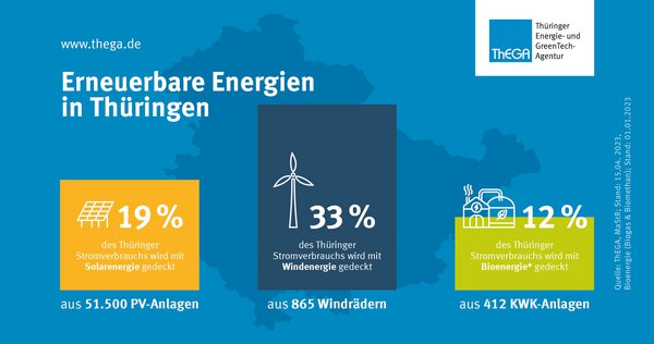 In Thüringen produzieren 412 Kraft-Wärme-Kopplungsanlagen (KWK) Strom mit Biogas und Biomethan. Diese verfügen über eine Gesamtleistung von 176 Megawatt. Bei einer Ausnutzung von 8.000 Volllaststunden im Jahr entspricht das etwa 12 Prozent des Thüringer Stromverbrauchs. 2022 sind vier KWK-Anlagen mit 2,9 Megawatt Leistung hinzugekommen. Bioenergieanlagen erzeugen Biogas, in dem sie vor allem Gülle aus der Schweine- und Rinderhaltung und pflanzliche Biomasse wie Mais vergären. Das so gewonnene Biogas wird in Blockheizkraftwerken zu Strom und Wärme umgewandelt. Die ThEGA geht davon aus, dass die Zahl der KWK-Anlagen mittelfristig nicht weiter wachsen werde. Zum einen sei bundesweit ein Rückgang bei der Massentierhaltung zu verzeichnen, weshalb die Potenziale für die Gaserzeugung weitestgehend ausgeschöpft seien. Andererseits habe Biogas – bezogen auf die genutzte Fläche – eine bis zu zehnfach schlechtere Energieausbeute als Solar- oder Windenergie.